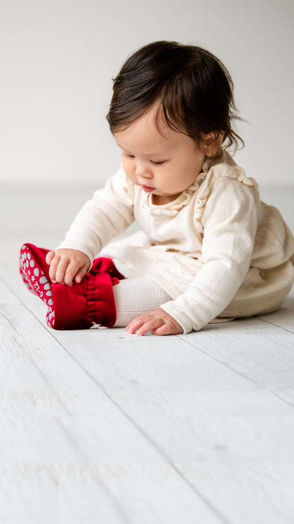 Stay-on, Non-Slip Crimson Red Velvet Booties + Frilly Sock Bundle