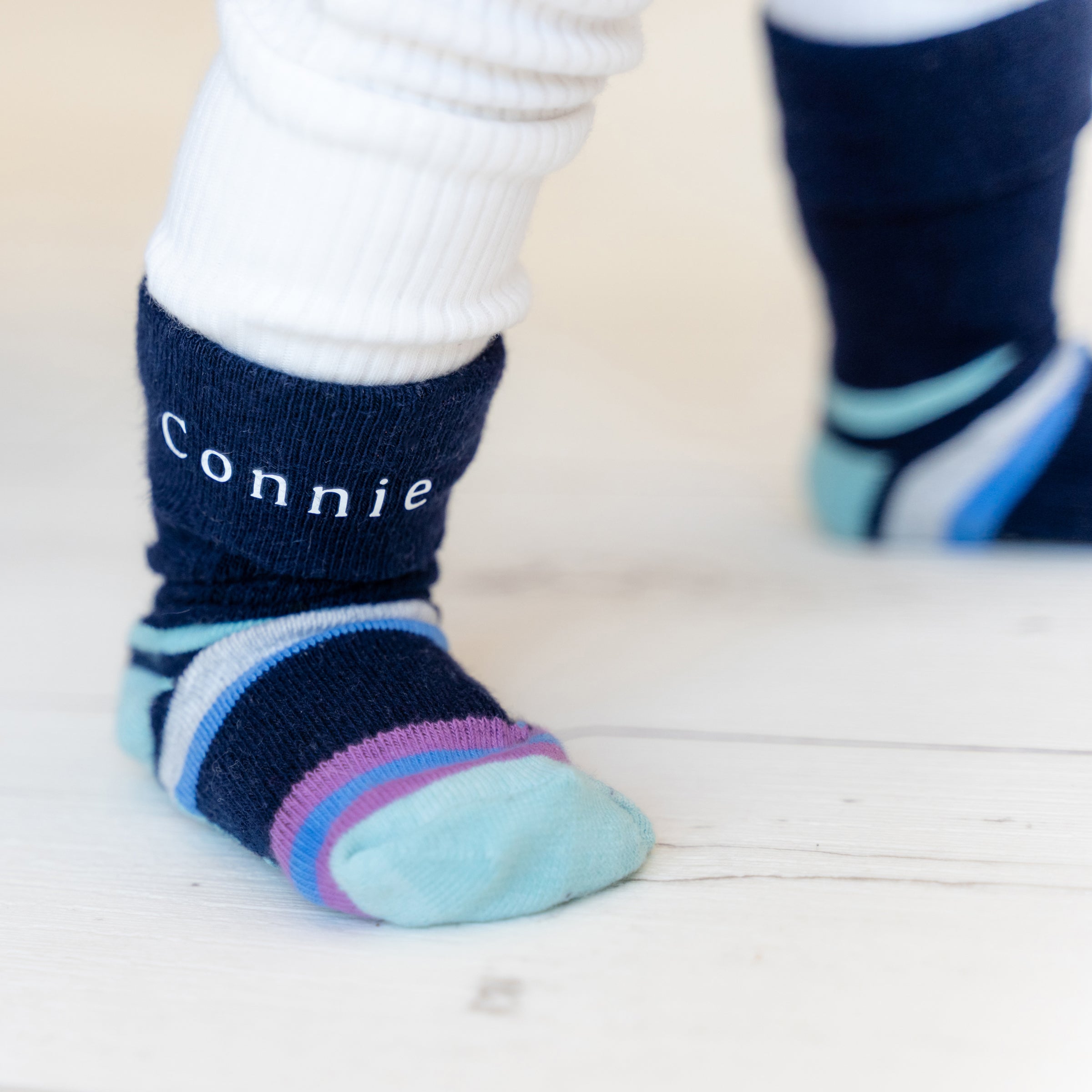 Personalised set of Multi-award winning Non-Slip Stay on Baby and Toddler Socks - Neutral Stripe- 6 months-3 years